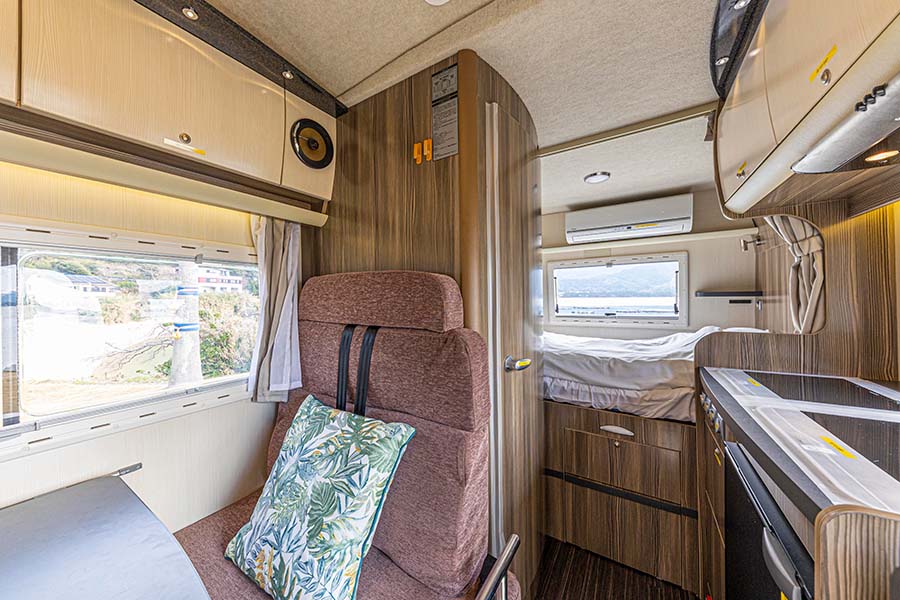 車内は高品質の家具、独立スプリング式のダブルベットが2台採用されており、寝心地も抜群。冷暖房完備なので季節を問わず、快適にお過ごしいただけます。