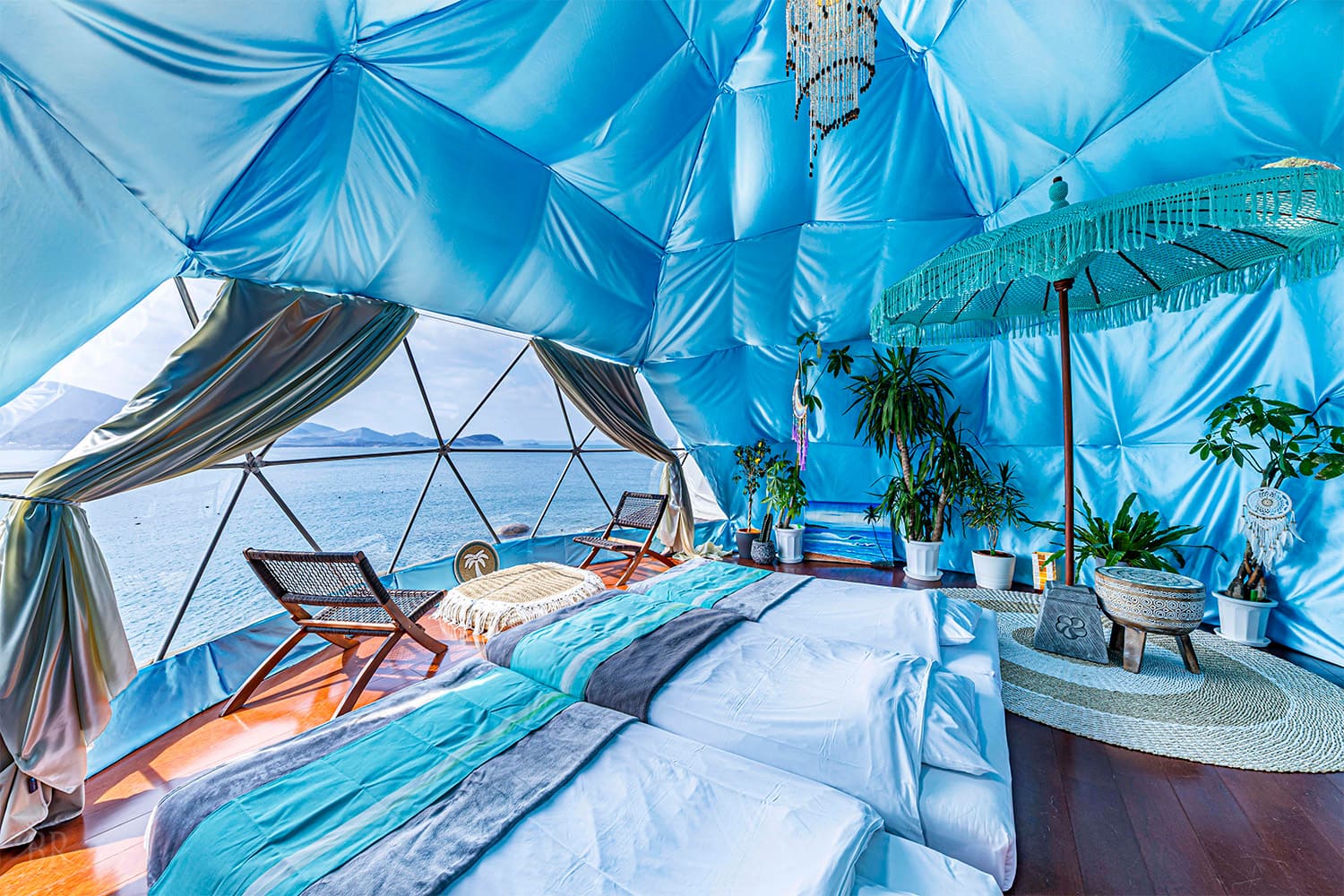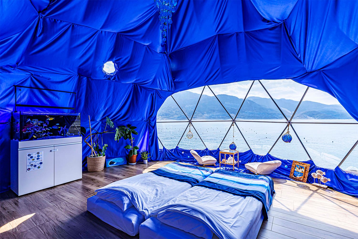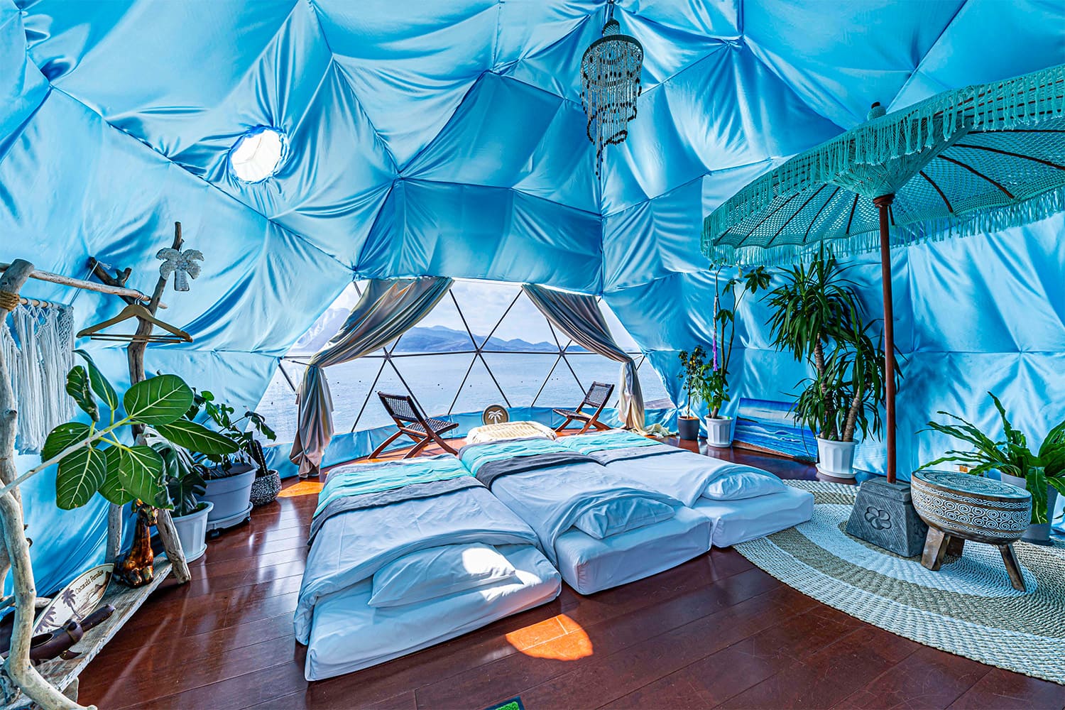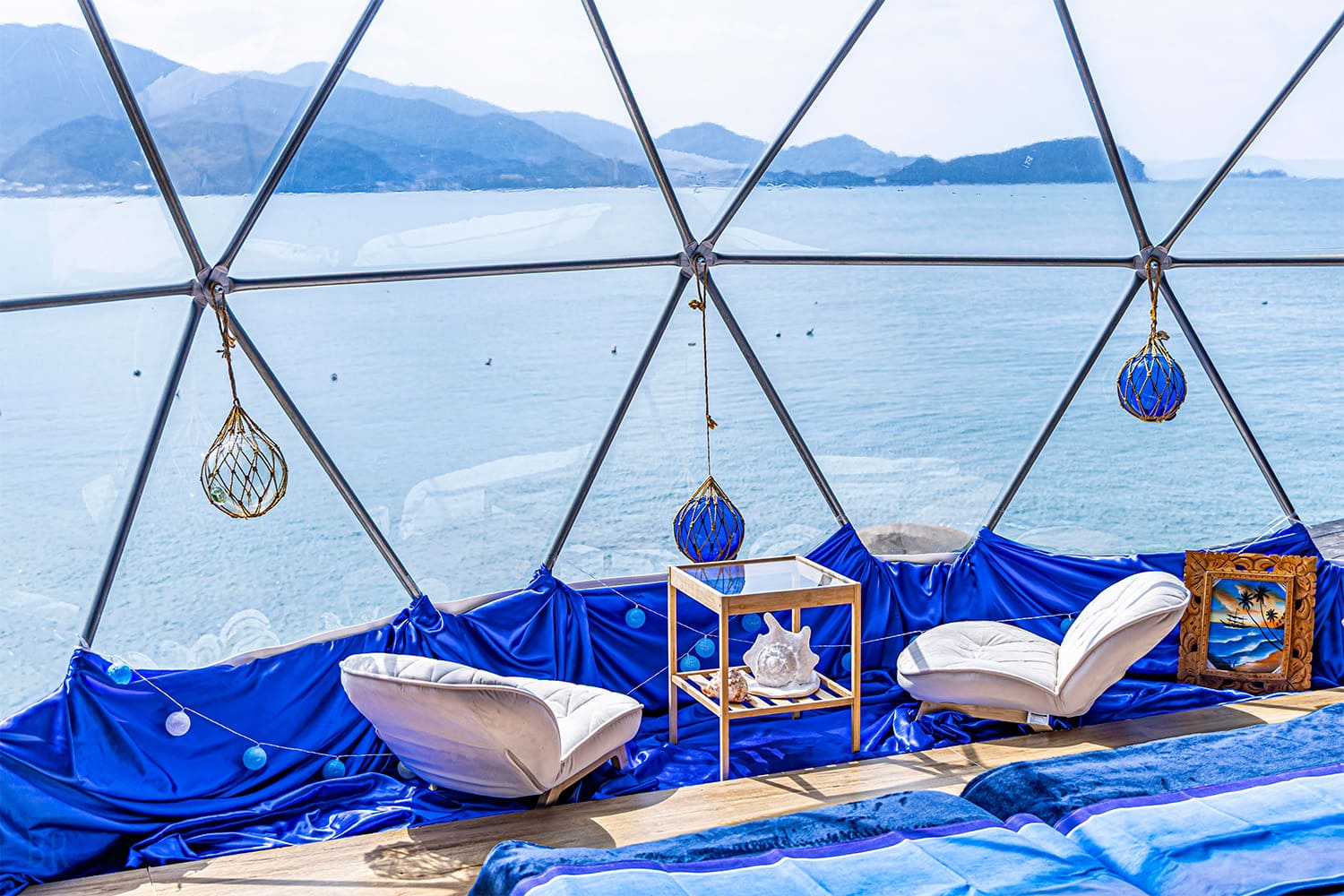 まるで海に漂着した宇宙船のような白く輝く4つの「ドームテント」から海を見ていると、ここが日本であることを忘れてしまいます。