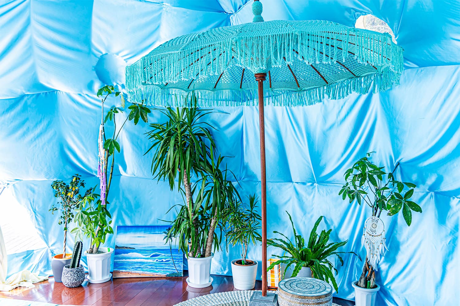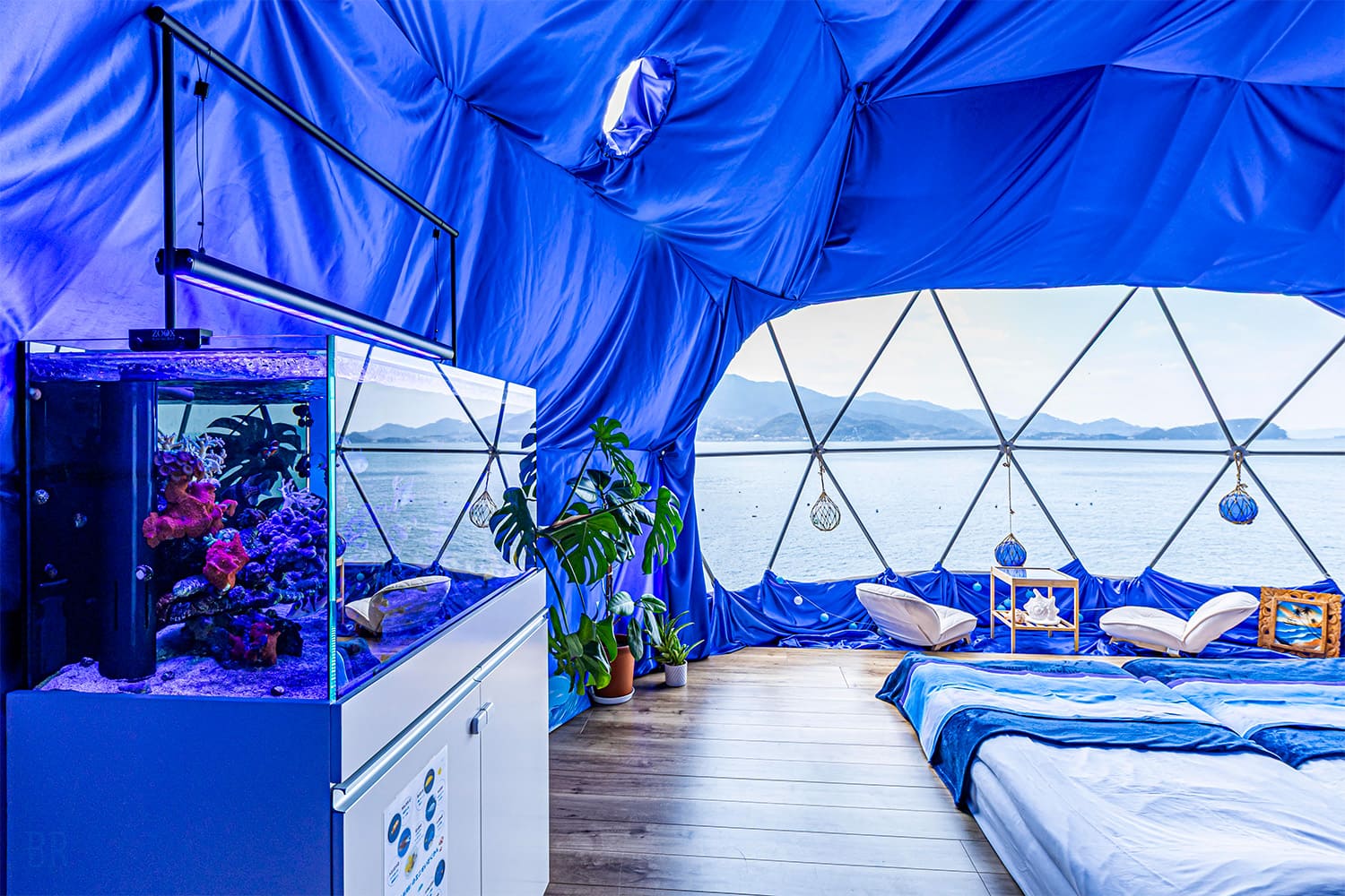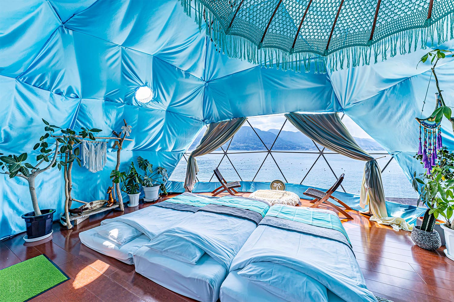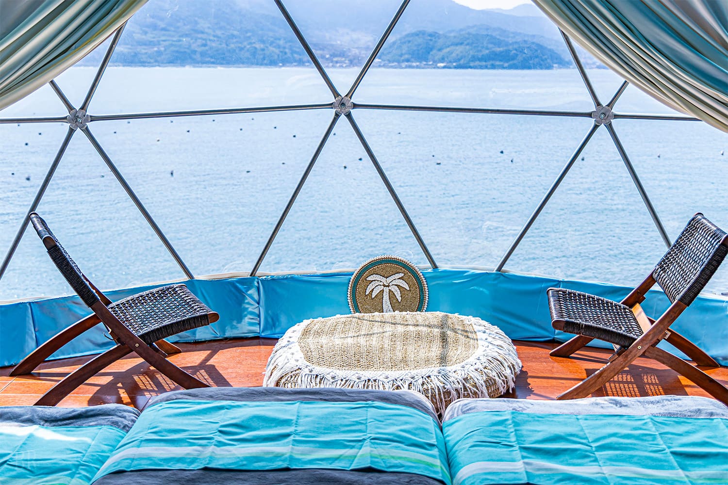 まるで海に漂着した宇宙船のような白く輝く4つの「ドームテント」から海を見ていると、ここが日本であることを忘れてしまいます。