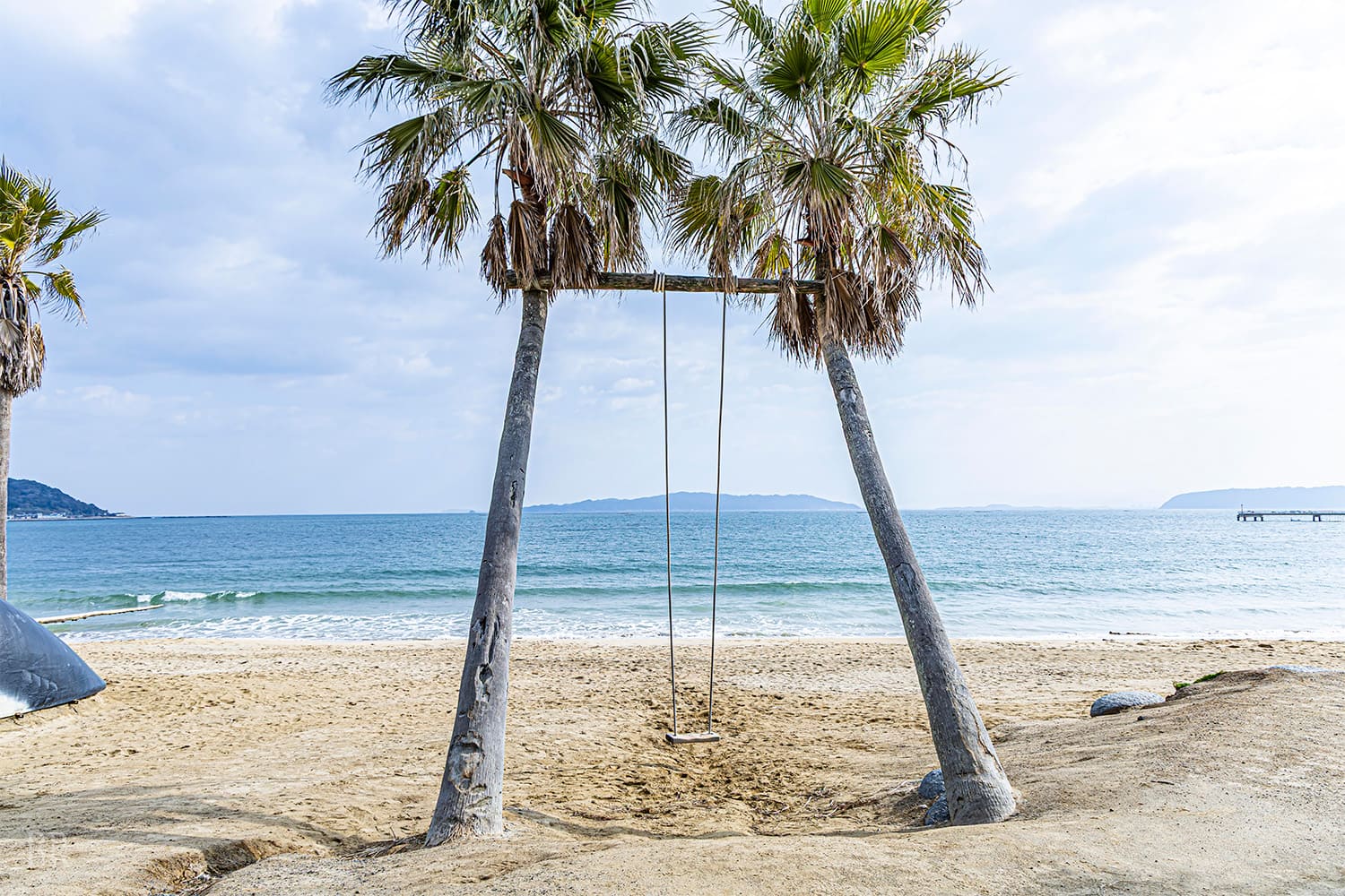ヤシの木ブランコは、糸島の海岸沿いにある人気のフォトスポットです。ヤシの木の下に設置されたブランコに乗り、青い海と空を背景に写真撮影を楽しめます。南国のような開放的な雰囲気が魅力で、糸島ドライブの立ち寄りスポットとして多くの観光客に人気があります。